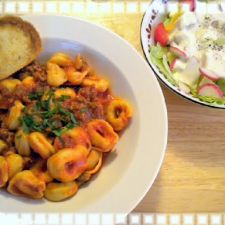 While pasta is cooking, heat oil in skillet over medium heat. Add onion and bell pepper and cook, stirring frequently, until tender, about 5 minutes. Add garlic and cook an additional 30 seconds.