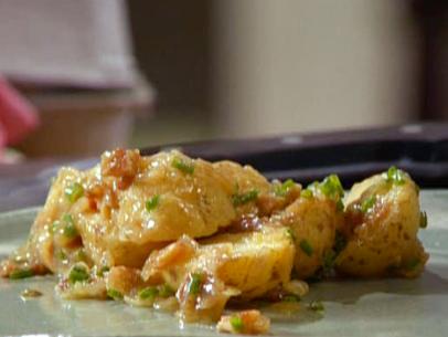 Coat a large straight-sided saute pan lightly with olive oil. Toss in the bacon and bring the pan to a medium heat. When the bacon is brown and crispy, toss in the onions and cook them until they are very soft and aromatic, 7 to 8 minutes. Add the stock and vinegar. Toss in the potatoes when they are still warm and cook until the liquid has absorbed into the potatoes. Taste and season with salt if needed. Toss in the chives and serve warm or at room temperature.