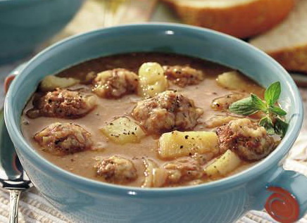 Coat meatballs with flour. Drop into the boiling broth; cover. Reduce heat to low. Cook, stirring frequently, for 45 minutes.