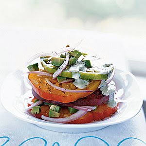 2. To prepare salad, slice each tomato crosswise into 4 equal slices (about 1/2 inch thick). Place 1 tomato slice on each of 4 salad plates; sprinkle slices evenly with 1/4 teaspoon salt. Top each serving with a few onion pieces and about 1 tablespoon avocado. Repeat layers 3 times, ending with avocado. Drizzle 2 tablespoons dressing over each serving; sprinkle with black pepper, if desired.