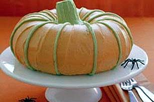ADD red and yellow food colorings to remaining white frosting to tint it orange. Spread onto cake to resemble pumpkin. Invert ice cream cone in hole in top of cake for the pumpkin's stem. Pipe the reserved green frosting in vertical lines down side of cake.