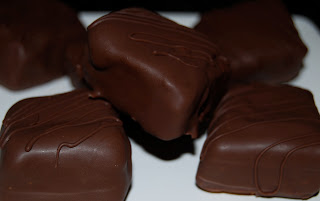 Using an electric mixer on high speed, beat your melted chocolate for 30 seconds. Add the Cool Whip to melted chocolate and beat just until combined and fluffy -30-60 seconds. Spread evenly into prepared 8x8' pan. Place in freezer for about 30 minutes (overnight might even be better). Remove from freezer, remove candy from pan and cut into squares. Return back to freezer. I worked in small doses so I could keep them hard and easier to work with.