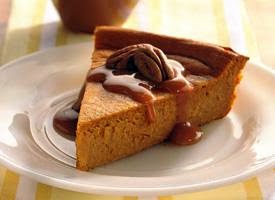 3. Bake about 45 minutes or just until puffed and center is dry (do not overbake). Cool completely, about 1 hour. Refrigerate at least 3 hours until chilled. Drizzle servings with caramel topping; garnish with pecan halves. Store covered in refrigerator.