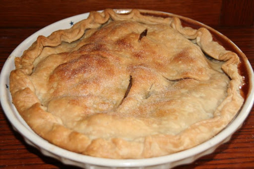 Place the bottom crust in your pan. Fill with apples, mounded slightly. Cover with a lattice work crust. Gently pour the sugar and butter liquid over the crust. Pour slowly so that it does not run off.