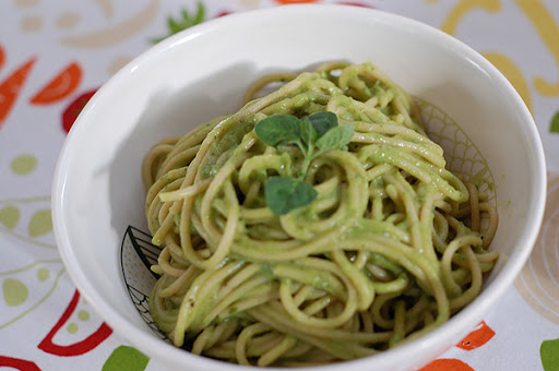 If the puree is still too thick add 2 more tablespoons of water an blend again. Toss with 1/2 pound cooked whole wheat angel hair pasta.