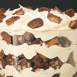 Place a third of the brownies in a 5-qt. glass bowl; top with a third of the remaining peanut butter cups. Spoon a third of the pudding mixture over the top. Repeat layers twice. Cover with remaining whipped topping; garnish with reserved peanut butter cups. Refrigerate until chilled. Yield: 20 servings (1 cup each).