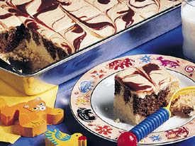 2. Pour two-thirds of batter (about 3 cups) into pan(s). Stir cocoa and baking soda into remaining batter. Drop chocolate batter by generous tablespoonfuls randomly in mounds onto peanut butter batter. Pull knife through batters in S-shaped curves in continuous motion for marbled design. Turn pan one-fourth turn; repeat marbling.