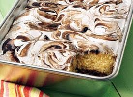 4. Spoon teaspoonfuls of marshmallow creme onto warm cake; carefully spread with knife dipped in hot water. Drop small dollops of reserved hot fudge topping randomly over marshmallow creme. Swirl topping through marshmallow creme with knife for marbled design. Cool 2 hours. Store uncovered at room temperature. (Once cut, store cake in the pan, uncovered, with plastic wrap pressed against cut sides.)