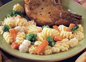 1. In large saucepan, cook pasta as directed on package, adding vegetables during last 3 to 5 minutes of cooking time. Cook until pasta nuggets and vegetables are tender. Drain well; return to saucepan.