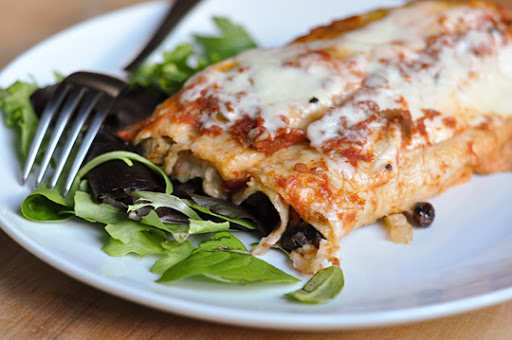 Cook bacon, then chicken, then veggies. Add 1/2 of picante, black bean in juice, and 1/2 of cheese. Roll in tortillas. Top with rest of sauce and cheese. Bake @ 375 for 40-45 min.