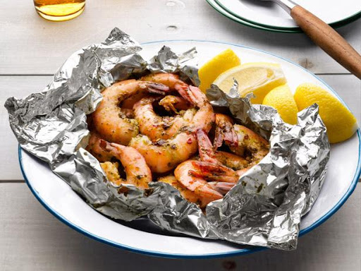 Toss with the juice of 1 lemon, 1 pound unpeeled large shrimp and a big pinch of red pepper flakes. Divide between 2 foil packets. Grill over high heat, 8 minutes.