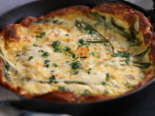 Using pot holders, carefully remove the pan from the oven. Add the butter to the hot pan and stir until melted. Arrange the asparagus in the bottom of the pan and then season with salt and pepper. Pour the egg mixture over the top. Bake until puffed and golden brown, about 15 minutes.