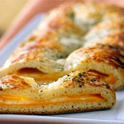 Place Cheddar and Monterey Jack cheese down one side of dough. Fold dough over cheese; pinch edges to seal. In bowl, mix Italian cheese and seasoning; sprinkle on top of dough