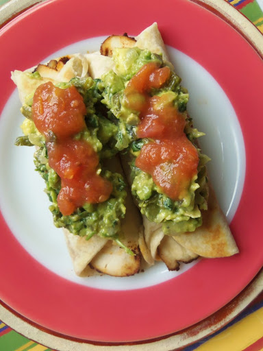 5. Spray the griddle or comal with Pam spray. Transfer the flautas to the hot surface, seam side down. Spray the tops of the flautas with Pam. Cook for 1 to 2 minutes on each side until golden and crispy. Serve flautas topped with guacamole, salsa, crema, and a little sprinkle of cheese. Yields 4 servings.
