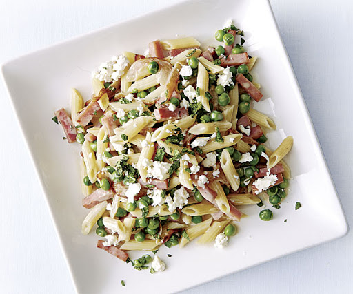 Fresh mint, a classic pairing with peas, brightens this creamy pasta dish that is a complete dinner. Serve with a side salad and some good rolls.