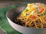 Meanwhile, heat the oil in a large nonstick frying pan over medium heat. Add the shallots, garlic, carrots, salt, and pepper. Cook until tender, about 8 minutes. Add the tomato paste and 1/2 cup of the hot pasta water. Stir to melt the tomato paste and create a sauce, adding more pasta water if necessary. Stir in the oregano, thyme, and parsley. Gently fold in the cooked pasta, peas, and the cheeses, adding more reserved pasta water if necessary. Transfer to a platter and serve immediately.