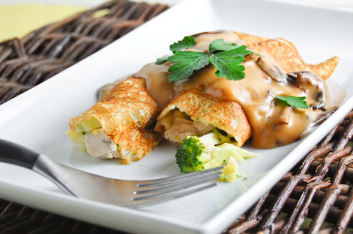 3) Preheat oven to 350ºF. For filling, combine cooked chicken, cooked broccoli, and the ½ cup reserved cheese mixture. Spoon about ¼ cup filling down the center of the unbrowned side of each crepe; roll up gently and securely. Arrange crepes, seam-side down, in a 13×9 inch baking dish. Cover with foil and bake in preheated oven for 20 minutes. Serve cheese-mushroom mixture over crêpes.