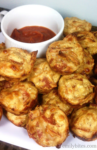 3. Divide the batter evenly amongst the prepared mini muffin tin cups. Bake in the oven for 18-22 minutes until golden. Serve with warm pizza sauce for dipping.