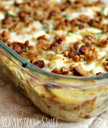 In a large bowl, combine the stuffing mix and melted butter. Set aside ½ cup of the mixture for the topping. In a large bowl add the zucchini, chicken, soup, onion and sour cream to the remaining stuffing. Place the zucchini mix into at greased 9x13 glass pan and spread out evenly. Sprinkle reserved ½ cup stuffing mix on top and bake uncovered at 350 degrees for 40 to 50 minutes or until golden brown.