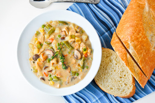 2) Heat olive oil in a Dutch oven over medium high heat. Sauté mushrooms in oil until slightly browned, about 5 minutes. Add onion, celery, thyme, sage, and kosher salt, and sauté an additional 5 minutes or until onion and celery are softened. Add frozen vegetables and cook for another 1-2 minutes.