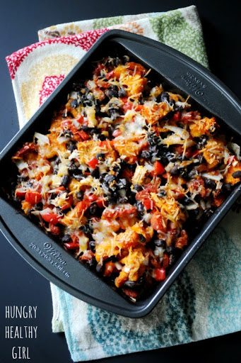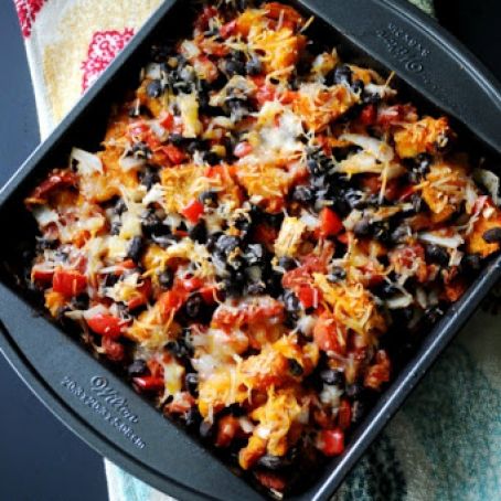 ◾Spread ½ cup salsa on the bottom of the baking dish. Arrange a tortilla on top, ripping into strips to get the right fit. Spoon a large layer of sweet potato/black bean mixture over tortilla strips. Spread the remaining ½ cup salsa over the sweet potato/black bean layer.