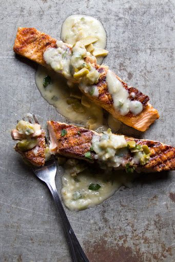 Salmon with Green Olive and Ramp Beurre Blanc