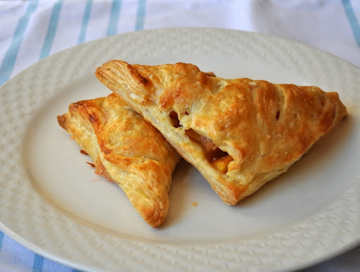 Top one half of each rectangle with peach filling. Fold the pastry over the filling to form a triangle, pressing out excess air. Use your fingers or a fork to press and seal the pastry together. Repeat with remaining squares. Brush each turnover with egg wash and then sprinkle with remaining sugar. Use a knife to make three 1 inch slits on the top of each pastry. Bake turnovers until golden, about 15 minutes. Serve warm.