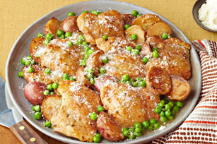 BRING liquid in skillet to boil on medium-high heat; cook 5 to 7 min. or until reduced to about 3/4 cup. Stir in peas; cook 1 min. or until heated through, stirring occasionally. Spoon over chicken and potatoes; sprinkle with cheese.