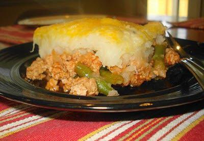 Scoop mashed potatoes on top of meat mixture and spread evenly. Sprinkle with cheese. Bake in 350 degree oven about 30 minutes.