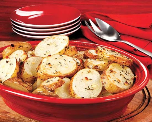 Preheat oven to 400°. Cut the unpeeled potatoes into 1/4-inch thick slices. Place, overlapping, in a greased casserole dish. In a small bowl, combine the butter and oil. Brush the potatoes with the mixture and pour the rest over the top of the potatoes. Sprinkle with the garlic, salt and THYME. Bake at 400° for 25-30 minutes or until the potatoes are browned and tender.