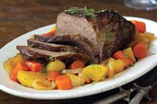 REMOVE meat from pan; cut across the grain into thin slices. Serve meat and vegetables topped with pan gravy. Sprinkle with parsley.
