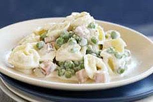 MIX cream cheese spread, milk and Parmesan in large saucepan until well blended. Stir in tortellini and peas; cover.