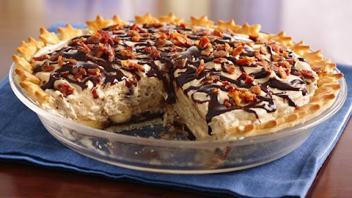Spread 1/2 cup chocolate sauce over cooled crust. Sprinkle half of the bacon pieces over chocolate sauce. Slice banana and arrange over bacon pieces. Spread cream cheese-peanut butter filling over bacon pieces. Drizzle 2 tablespoons chocolate sauce over filling. Sprinkle remaining bacon pieces over top of pie. Refrigerate until ready to serve. Cover and refrigerate any remaining pie.
