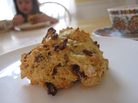In a bowl whisk together the milk, the egg, the brown sugar, and the vanilla until the mixture is combined well. In another bowl stir together the flour, the oats, the baking powder, the baking soda, and the salt and blend in the butter until the mixture resembles coarse meal. Sir in the dates and the milk mixture until the mixture just forms a sticky dough. Drop the dough by 1/3-cup measures onto an ungreased baking sheet and bake the scones in the middle of a preheated 400°F. for 15 to 18 minutes, or until they are golden. (Alternatively the scones may be dropped onto a hot greased griddle and cooked over moderate heat, turning them, for 15 to 18 minutes, or until they are golden on both sides and cooked through.)