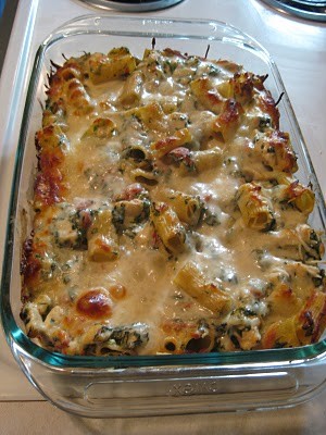 Drain chopped spinach well, pressing between paper towels. Stir in rigatoni, spinach, chicken, & next 4 ingredients into onion in bowl. Spoon mixture into dish & sprinkle evenly with shredded mozzarella cheese. Bake covered at 375 for 30 minutes; uncover & bake 15 more minutes or until bubbly.