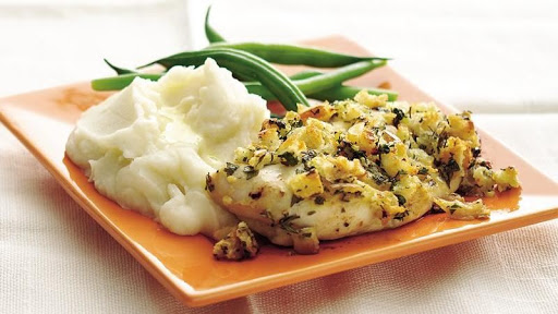 3. Spread mustard mixture on both sides of each chicken breast; place in pan. Spoon bread crumb mixture evenly on top of chicken; press in firmly.