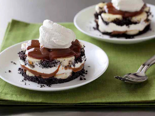 For Serving: Using a round 4-inch mold directly on the serving plate, put a layer of the cookie mixture, then the slices of bananas, cover with the baked condensed milk (now toffee) and repeat the layers. Remove the mold and garnish with a dollop of cream.