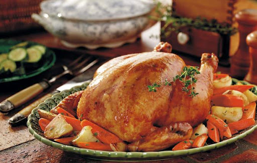 7.Remove celery and onion from cavity of chicken before serving. Serve chicken with roasted potatoes, carrots and onions.