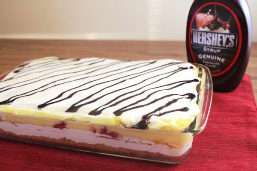 Drizzle (or pour, your choice) the chocolate syrup on top of the Cool Whip layer.