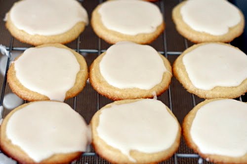 In a small bowl, whisk together to confectioners' sugar, lemon juice, and zest utnil it forms a thick but pourable glaze (add more lemon juice if necessary). Dip the top of each cookie into the glaze and let set, about 15 minutes.