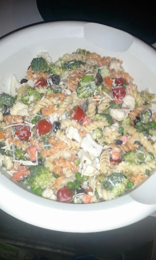 A beautiful, colorful pasta salad that is yummy and great for work food days!