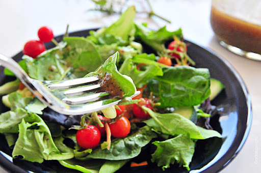 Add apple cider vinegar to the pan, whisking to combine as pouring. Continue to whisk until the vinaigrette has thickened slightly. Add bacon bits back to the vinaigrette, if desired.