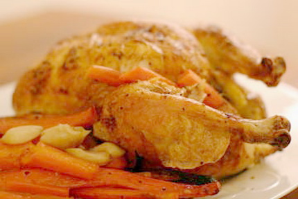 My mother found this recipe in the weekend Wall St. Journal and we were all quite pleased with the results. The recipe comes from Orange County restauranteur Liza Goodell. Mom cooked the chicken in a large cast-iron frying pan, and as instructed basted every 15 minutes. Because the chicken’s back is resting in the broth a bit, it actually gets braised, while the rest of the chicken roasts. The chicken doesn’t dry out because of the extra broth in the pan and the frequent basting. This is an easy method for roasting a flavorful chicken. (Courtesy of Simply Recipes)