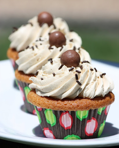 Malted Espresso Cupcakes topped with Coffee Buttercream