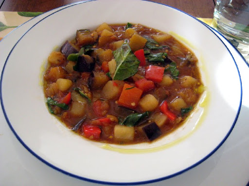 In a 12 to 14-inch saucepan with 3-inch sides, heat the olive oil over a medium-high flame until hot but not smoking. Add the garlic and onion and cool until a light golden brown, about 5 minutes. Add the potato cubes and cook until light golden brown on all sides, about 5 minutes more. Add the rest of the vegetables except the zucchini flowers and let cook until soft, about 15 minutes more.