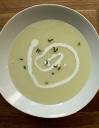 1. Wrap the thyme sprigs in a layer of cheesecloth, then tie with kitchen twine. In a large pot set over high heat, add 6 cups water and set over high heat. Add the leeks, potatoes and bay leaves, bring to a boil and add the salt.