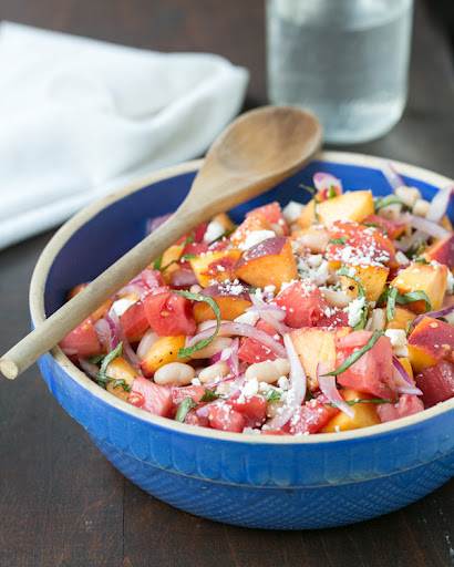 4 Drain the onions and squeeze them dry. In a large bowl, mix together tomatoes, peaches, beans, basil, red onion, and dressing gently together. Add a few additional pinches kosher salt and fresh ground pepper. Sprinkle with crumbled feta cheese.