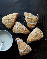 In a medium bowl, whisk the confectioners’ sugar with the remaining 2 tablespoons plus 2 teaspoons of lemon juice until the glaze is smooth. Drizzle the lemon glaze over the scones and let stand for 15 minutes before serving.