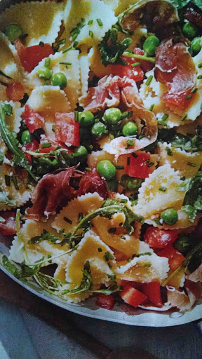 2. Transfer pasta to a warmed serving bowl. Immediately add the butter, arugula, peas (fava beans), prosciutto, cheese and tomatoes. Tossing constantly, gradually add 2 to 3 tables. of the reserved pasta water. Continue adding water until sauce turns rich and creamy. Add the chives and basil, and toss again. Season with salt and pepper.