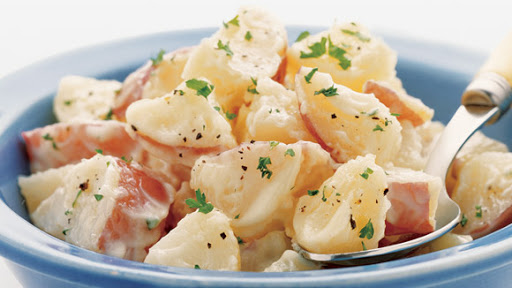 1. Cover potatoes and Bouillon Cube with water in 4-quart saucepot. Bring to a boil over high heat. Reduce heat and cook uncovered 10 minutes or until potatoes are tender. Drain; DO NOT RINSE. Let cool slightly.